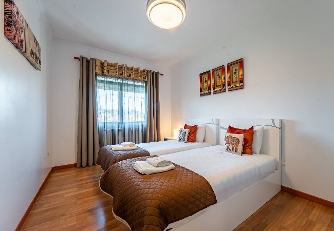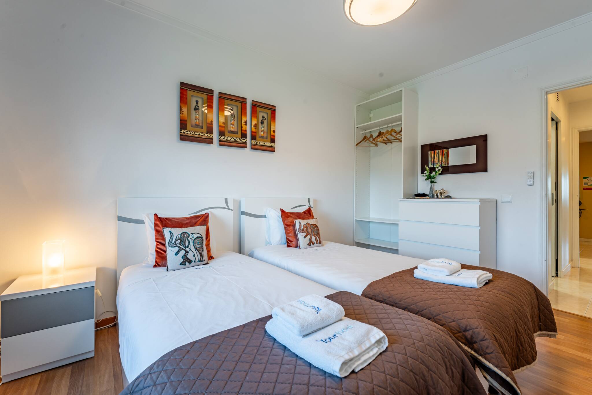 O apartamento conta com dois quartos confortáveis, oferecendo flexibilidade de acomodação com uma cama de casal, uma cama de sofá-cama e duas camas individuais. A distribuição dos espaços permite privacidade e conforto para todos os hóspedes.