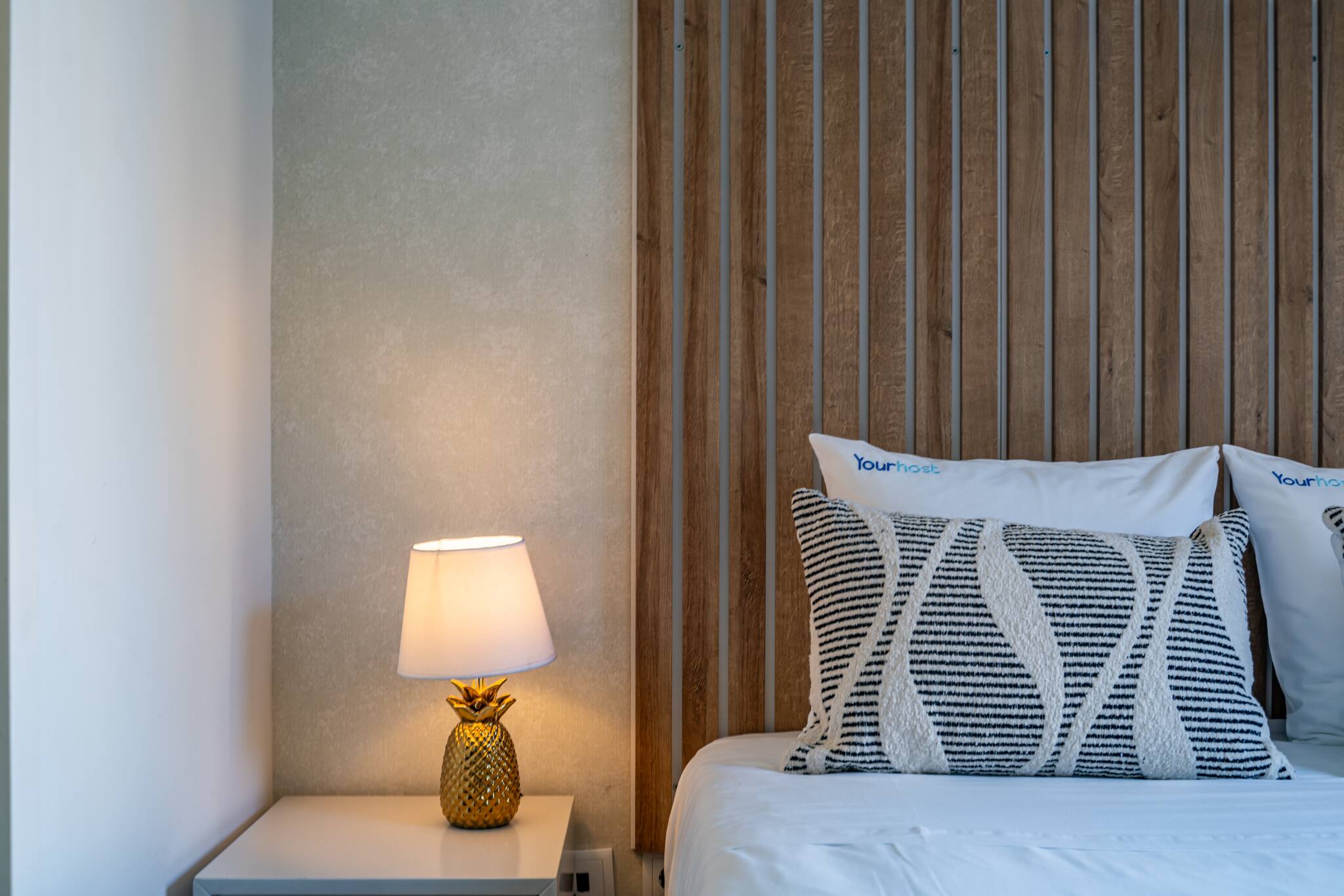Ambiente acolhedor – O apartamento possui um quarto confortável com uma cama de casal, roupas de cama de qualidade e espaço para armazenamento.