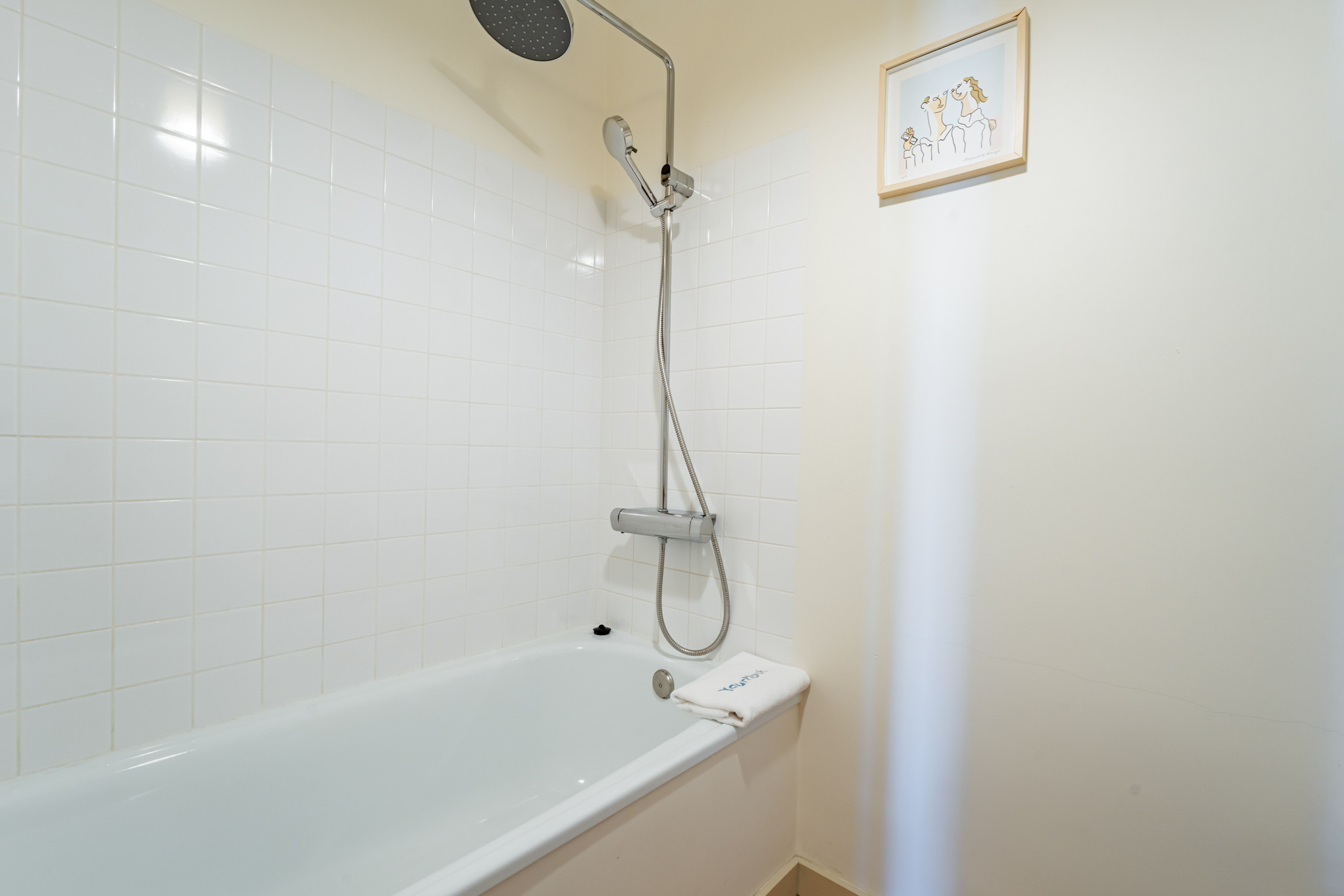 A casa de banho é moderna e funcional, com chuveiro, toalhas macias e produtos de higiene pessoal.