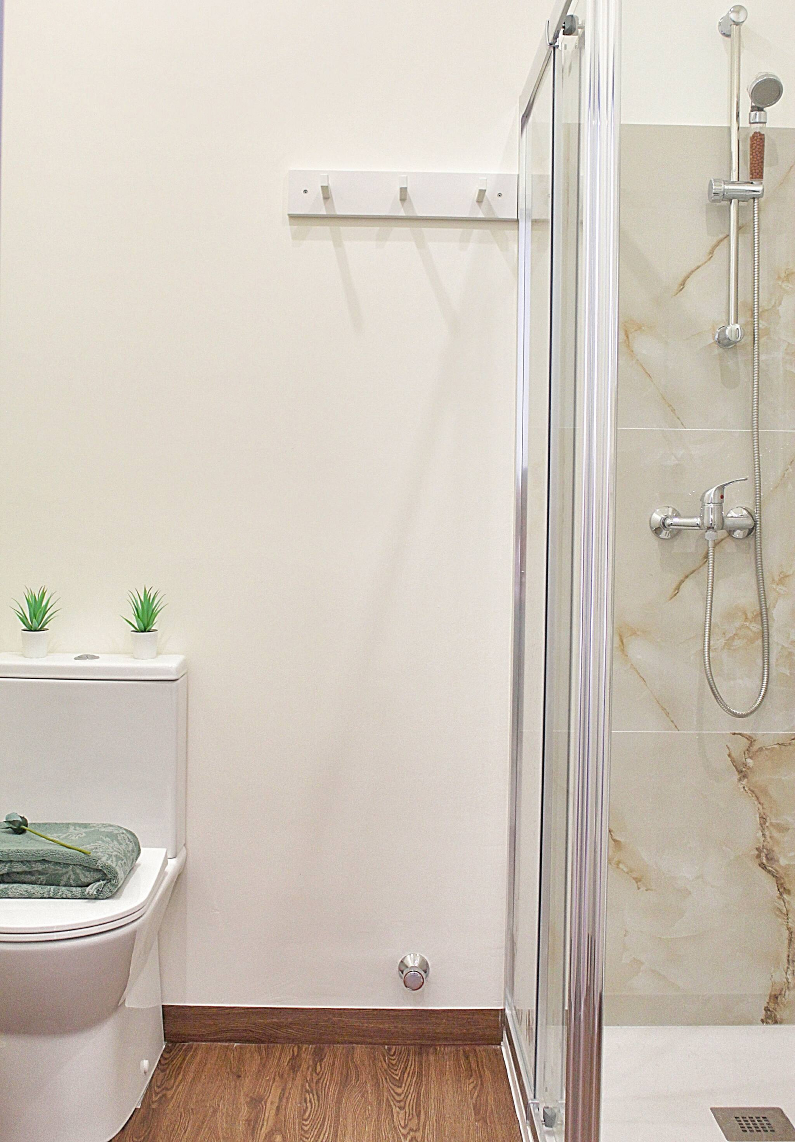 O banheiro privativo com chuveiro garante conforto e privacidade. Amenidades como água quente, kit de primeiros socorros, produtos de limpeza, ferro de passar e cabides completam a experiência, tornando a estadia extremamente conveniente.