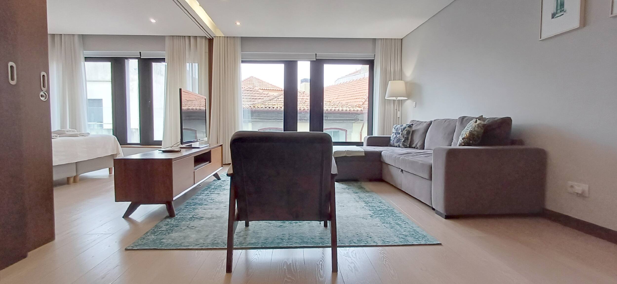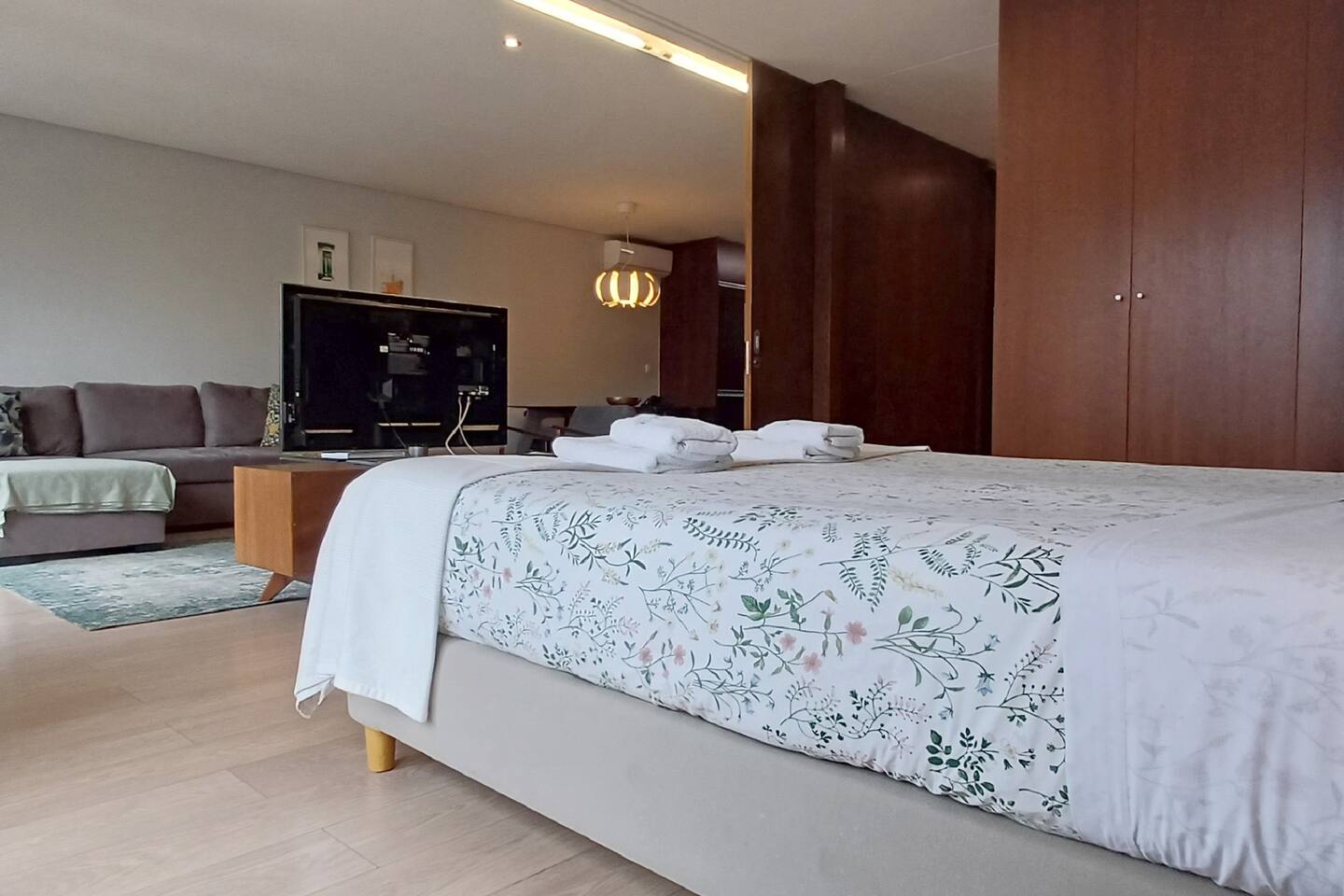 O apartamento oferece um ambiente luminoso e moderno, com 45 metros quadrados cuidadosamente organizados para garantir máximo conforto. Conta com um quarto principal equipado com uma cama de casal confortável e um sofá-cama adicional, permitindo acomodar até 4 pessoas com elegância e privacidade.