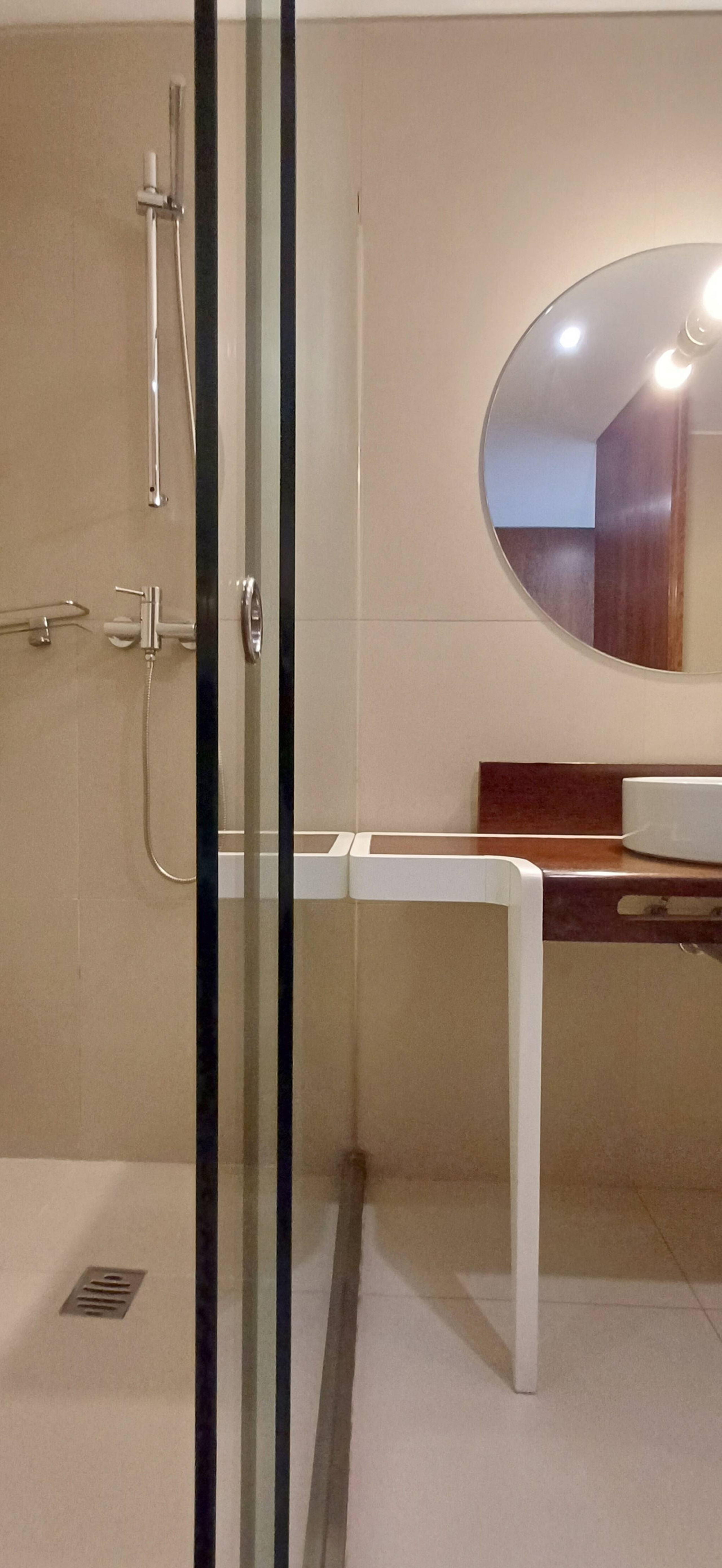 O banheiro privativo com chuveiro oferece todo o conforto e privacidade necessários. Detalhes como roupeiro, cabides, tábua de passar, produtos de limpeza e kit de primeiros socorros demonstram a atenção meticulosa aos pormenores.