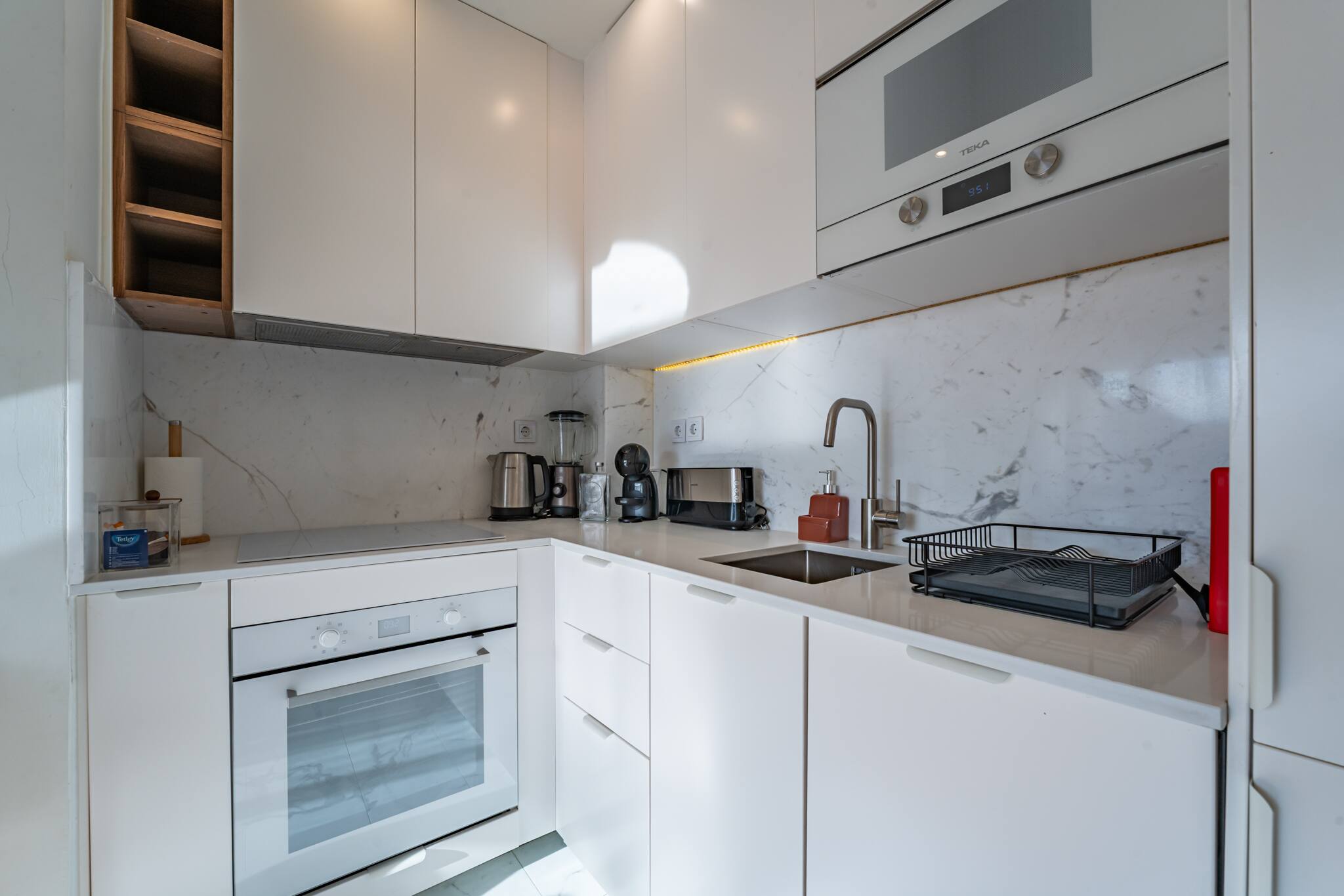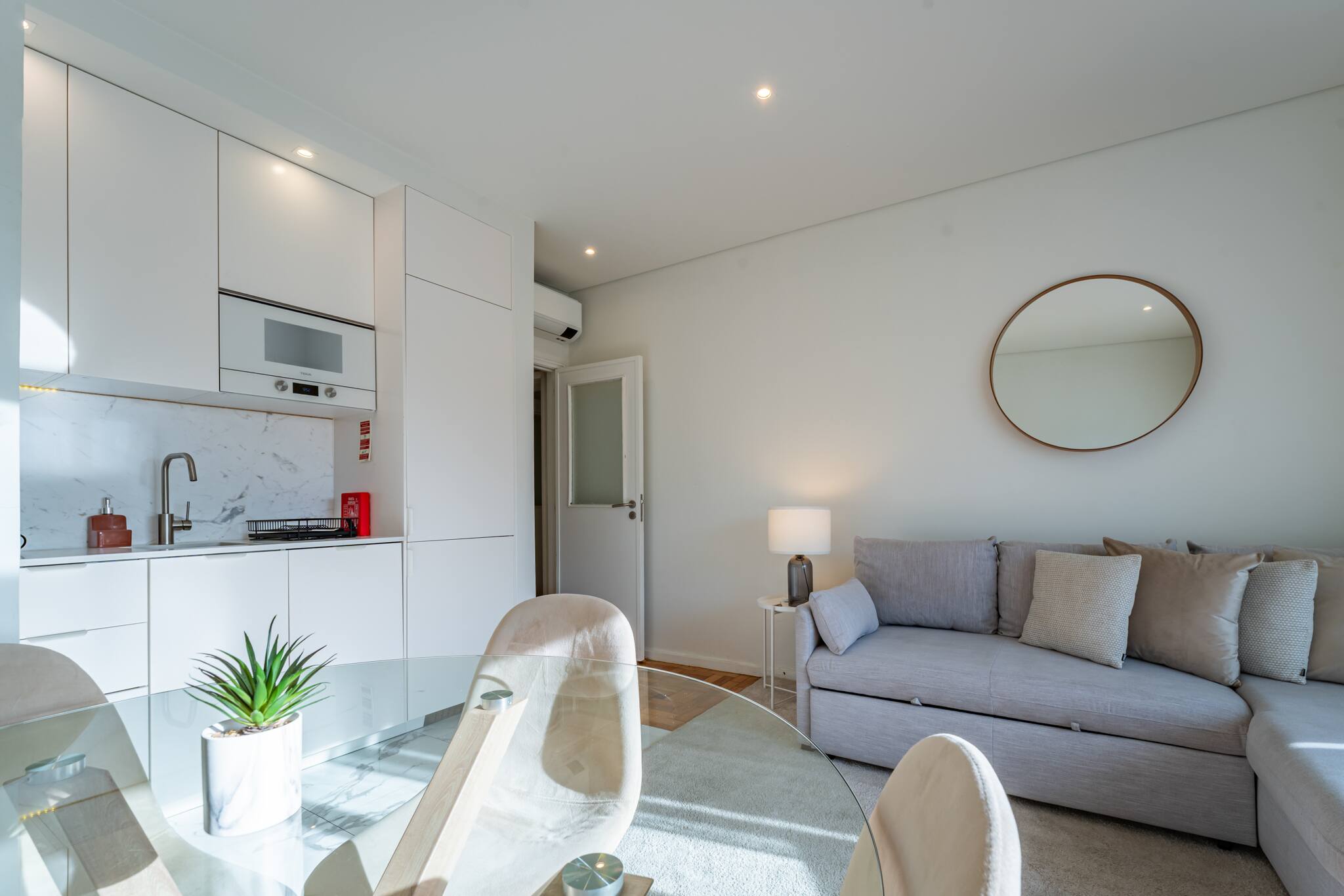 O apartamento possui uma sala de jantar e estar onde existe um sofá-cama de casal muito confortável, uma televisão de ecrã plano com canais por satélite, uma cozinha totalmente equipada, com frigorífico, forno, máquina de lavar loiça, micro-ondas, máquina de café Nespresso, chaleira elétrica, torradeira, liquidificadora, cafeteira italiana.