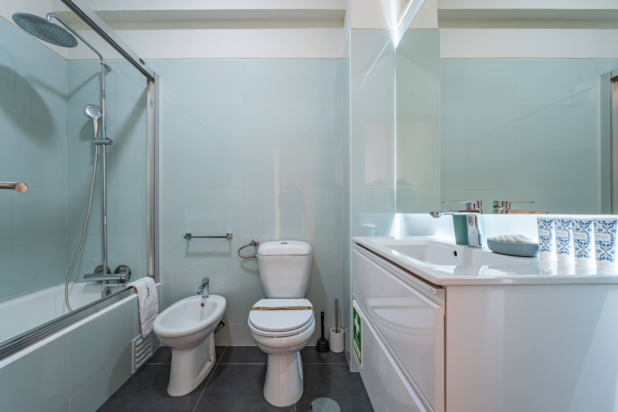 O apartamento conta com 2 casas de banho, sendo uma com chuveiro e outra com banheira, oferecendo flexibilidade e conforto para todos. Detalhes como produtos de limpeza, kit de primeiros socorros, detectores de fumo e monóxido de carbono demonstram nossa preocupação com a segurança da sua família.