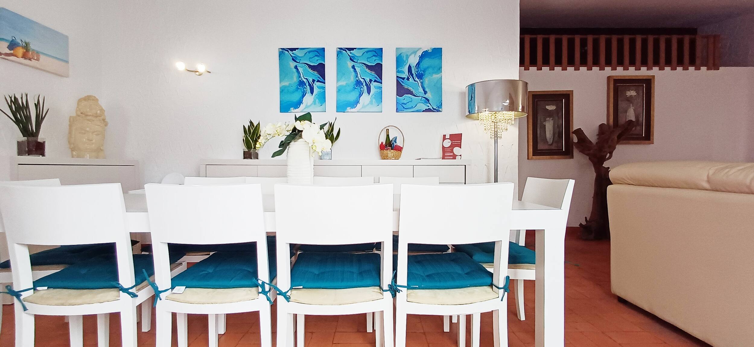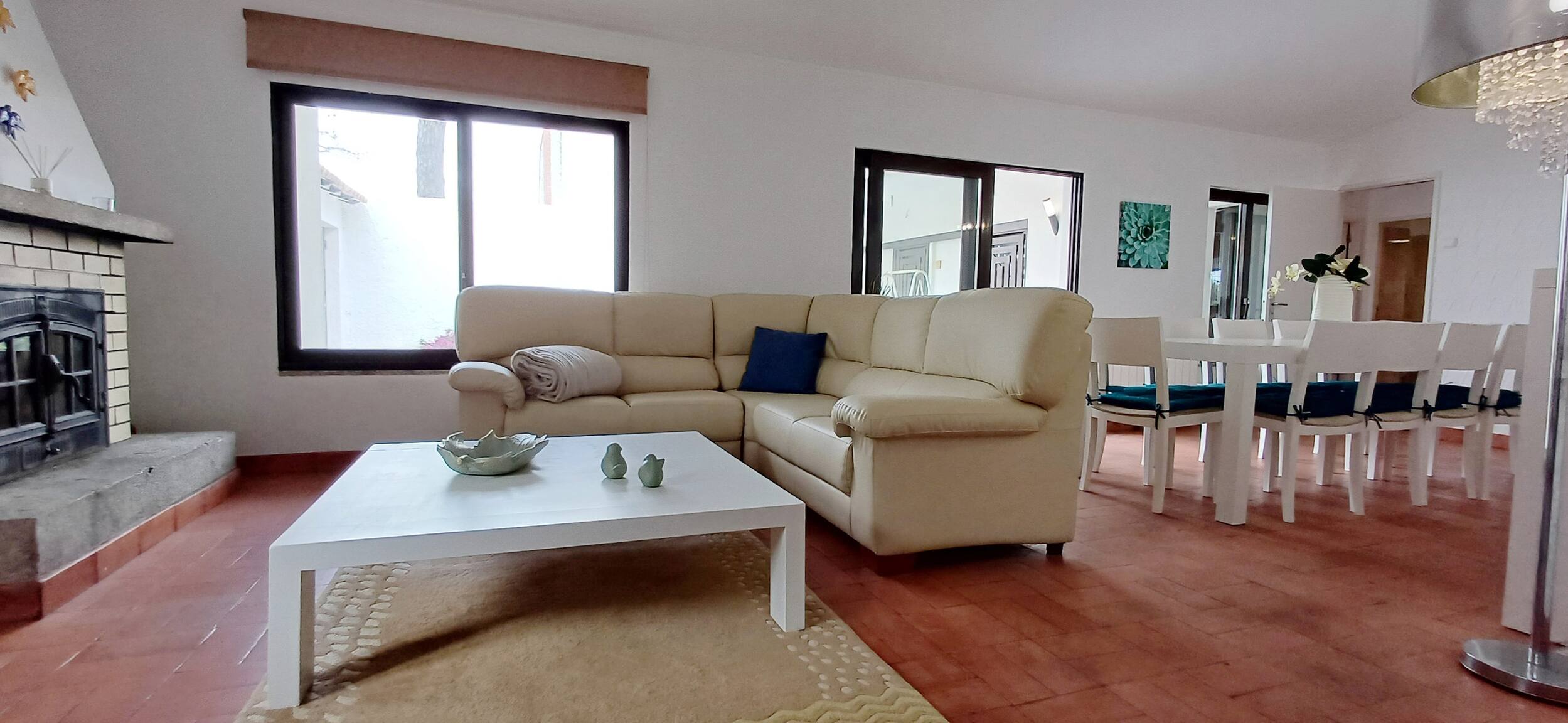 Sala de Estar: Espaçosa, equipada com TV, sofá e área de refeições.