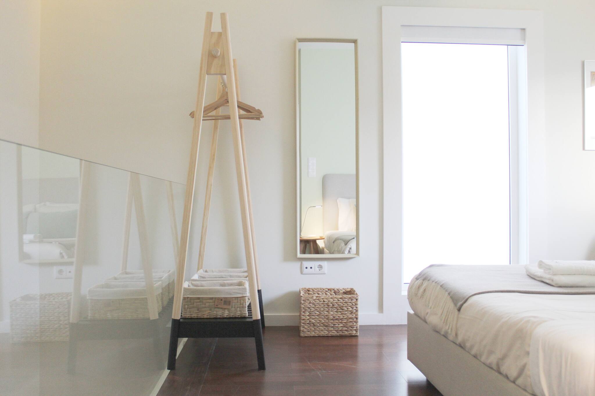 Casa renovada com design moderno e estilo funcional. No piso de entrada tem uma cozinha em open-space e uma área de refeições. Dispõe junto à entrada de um armário fechado com alguns cabides para pendurar a sua roupa. Tem ainda nesse piso uma área de estar com um confortável sofá-cama com chaise-longue e televisão LCD.