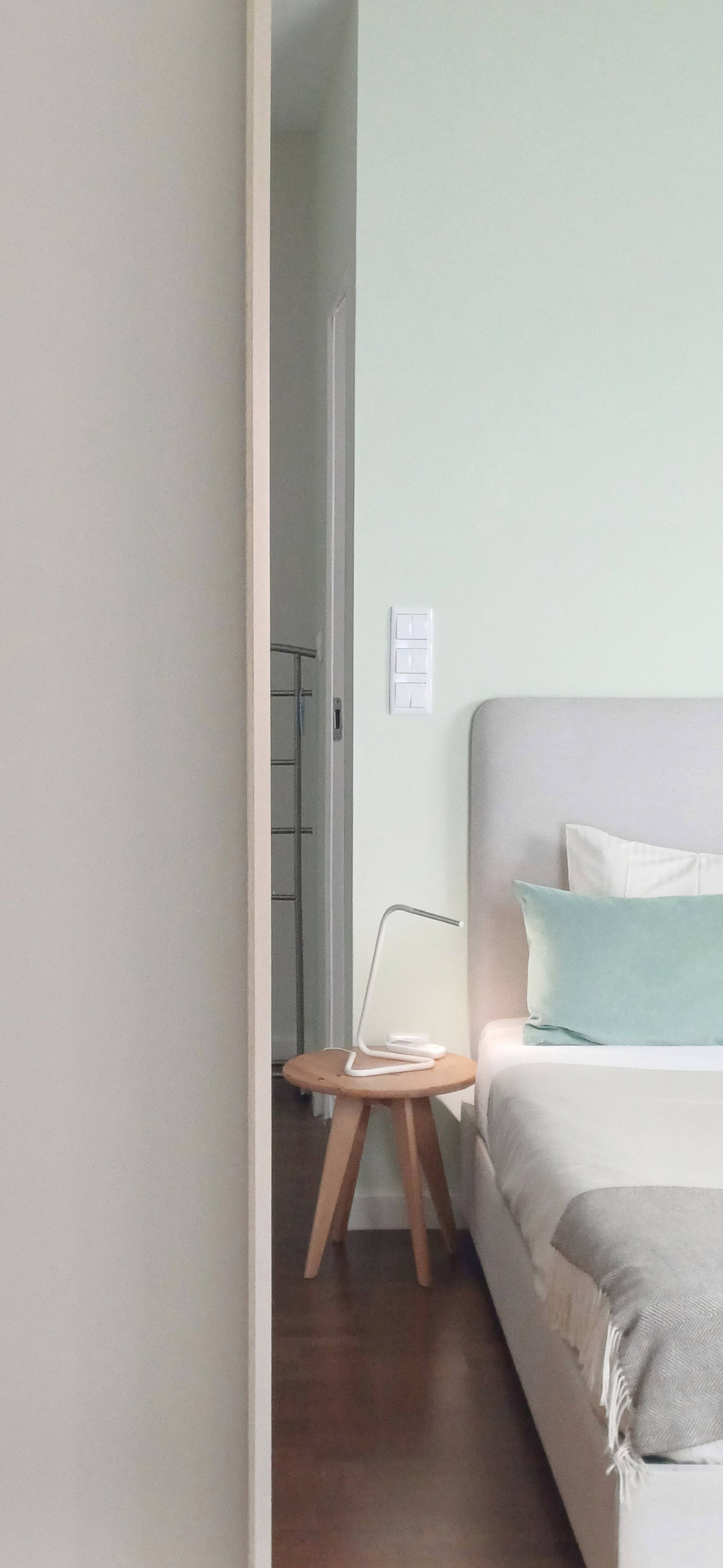 No primeiro piso há um quarto espaçoso, luminoso, com espaço para arrumação de roupas e um quarto de banho completo com luz natural.