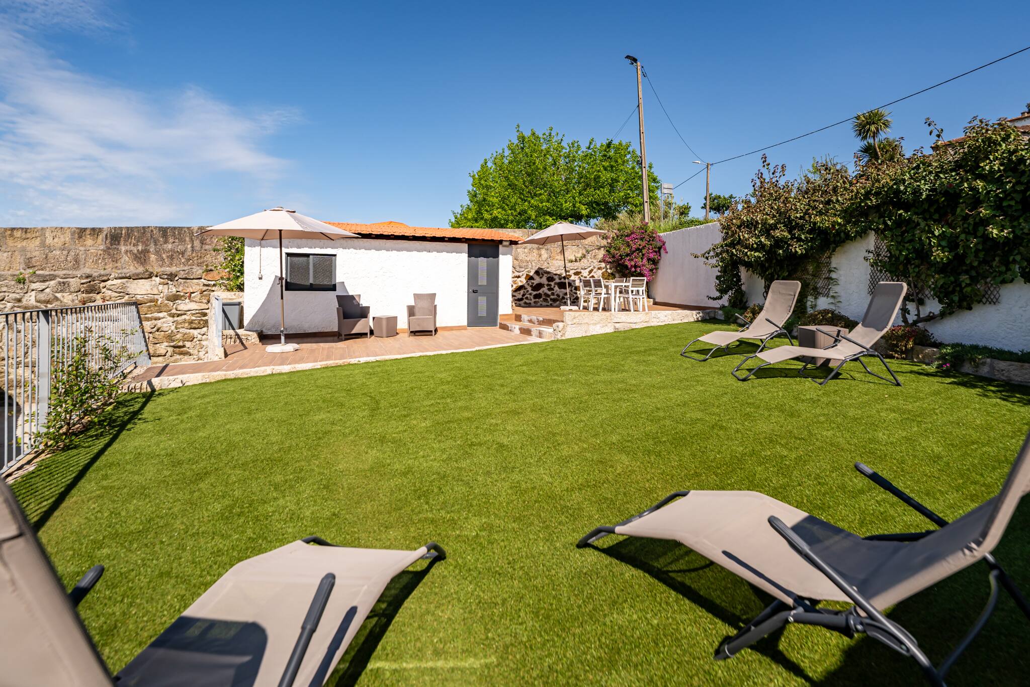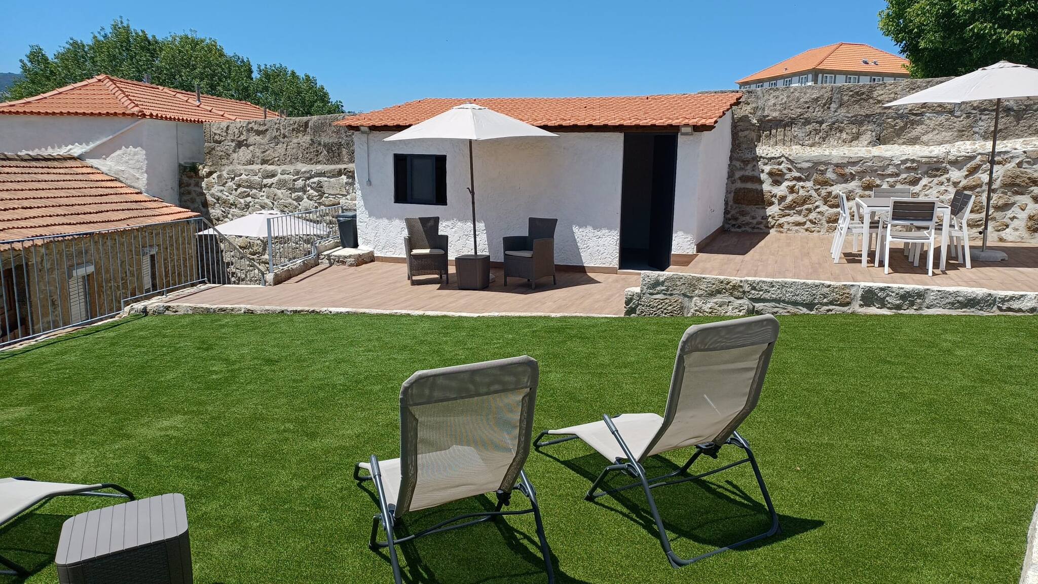 NOVIDADE: Espaço exterior comum, composto por zona relvada com espreguiçadeiras e zona de refeições com mesa e cadeiras de exterior.