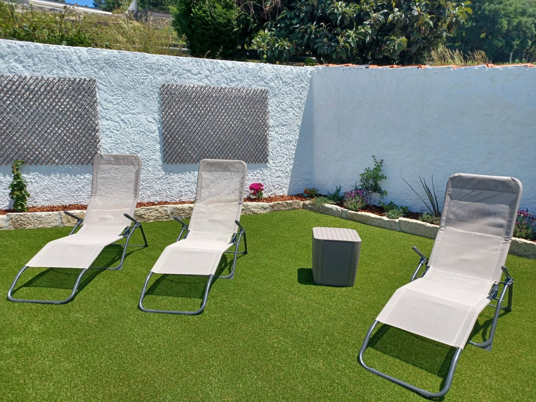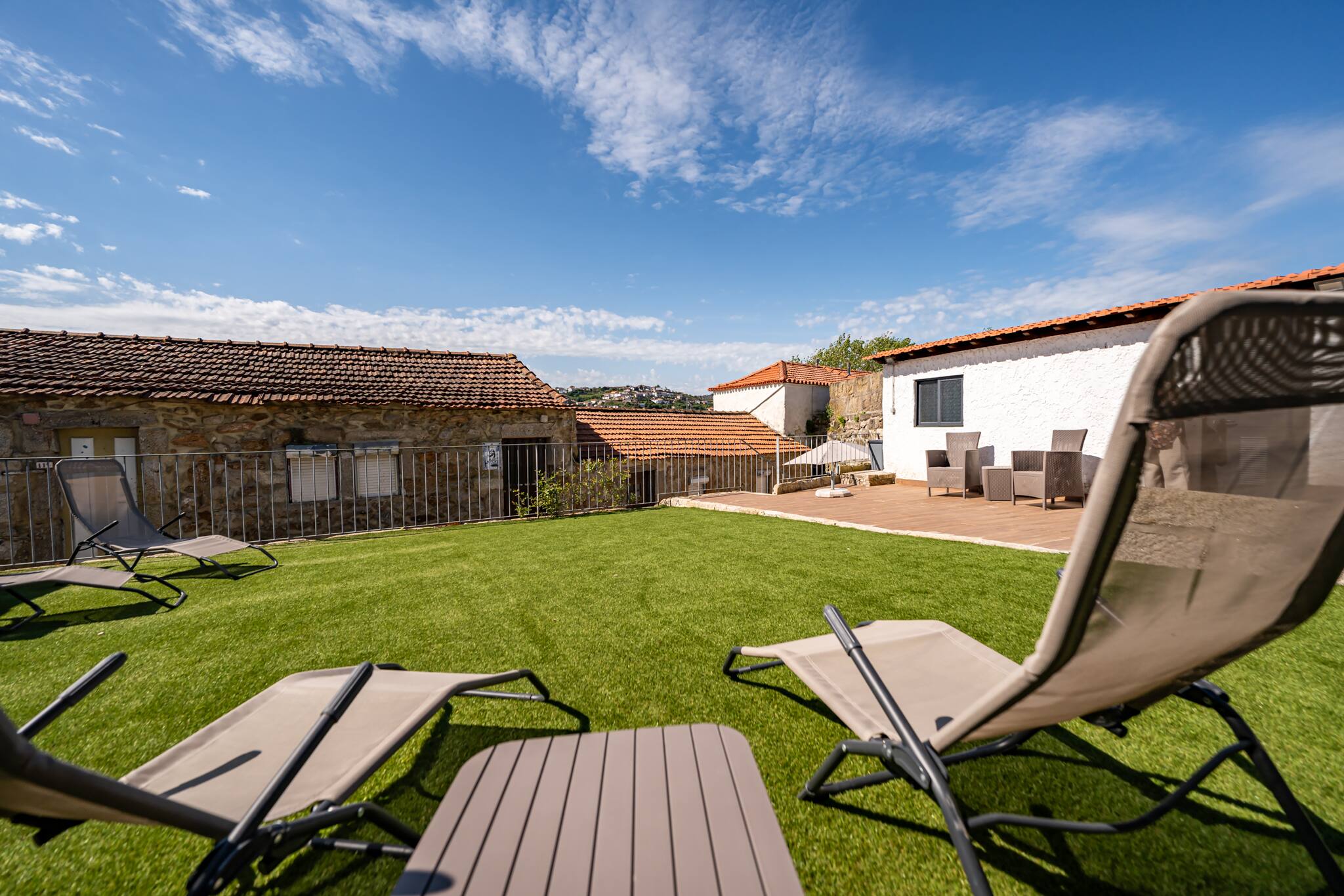 NOVIDADE: Espaço exterior comum, composto por zona relvada com espreguiçadeiras e zona de refeições com mesa e cadeiras de exterior.