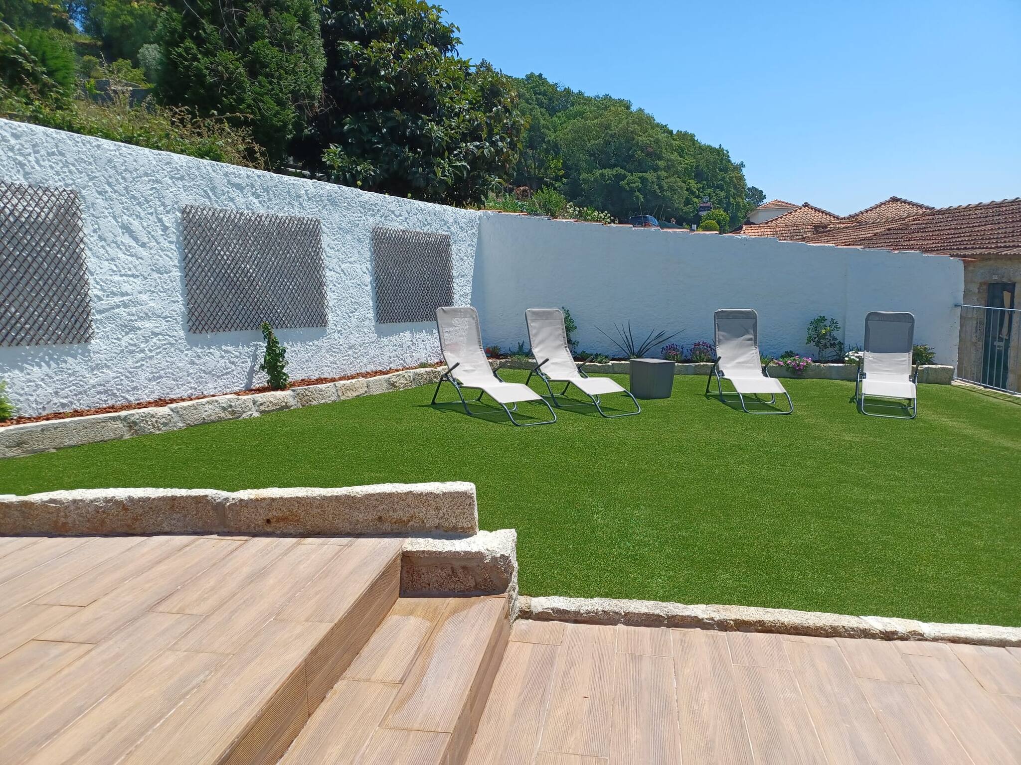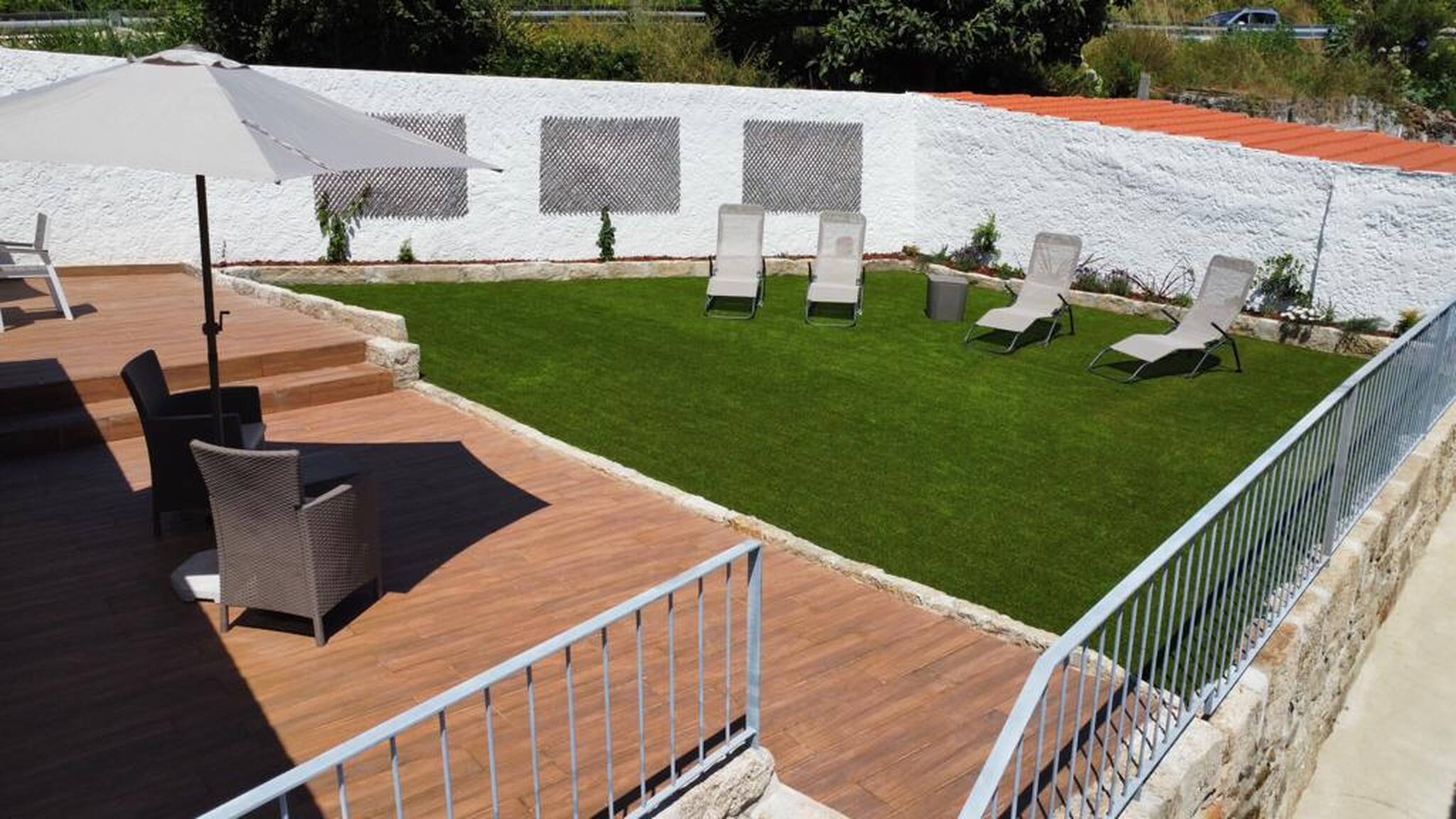 NOVIDADE: Espaço exterior comum, composto por zona relvada com espreguiçadeiras e zona de refeições com mesa e cadeiras de exterior.