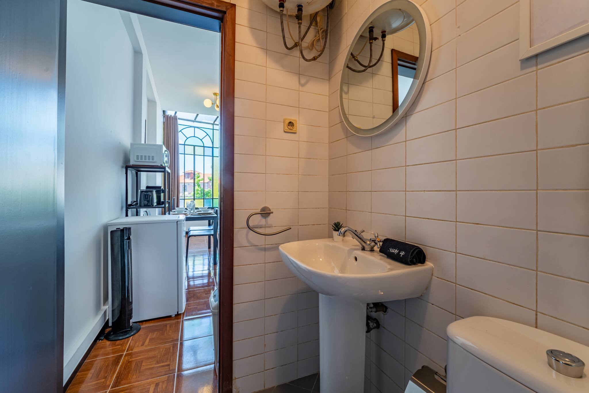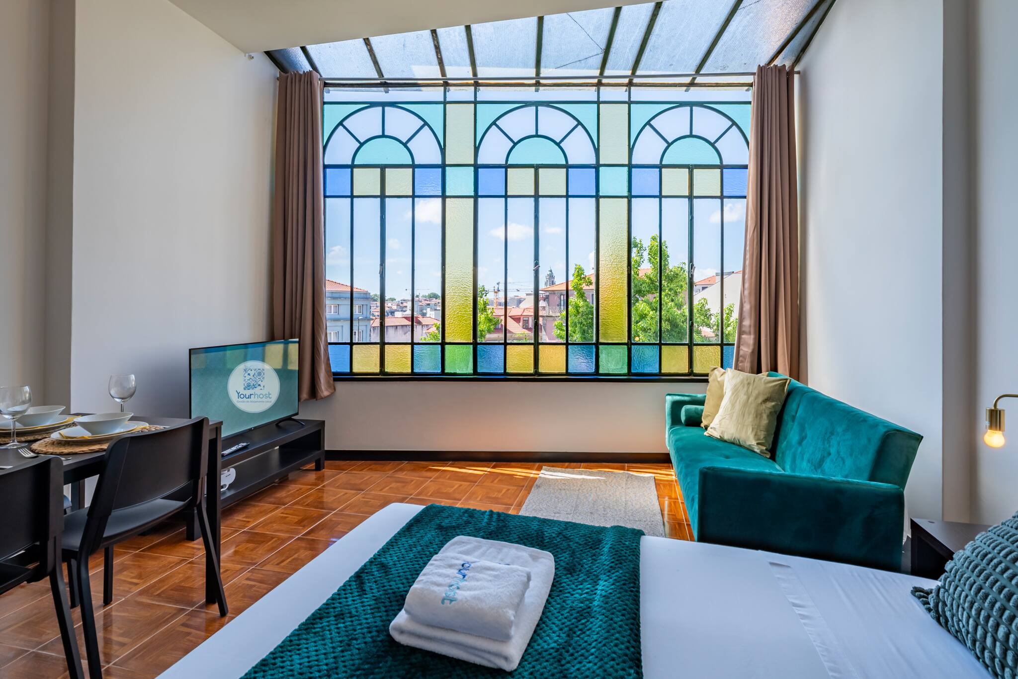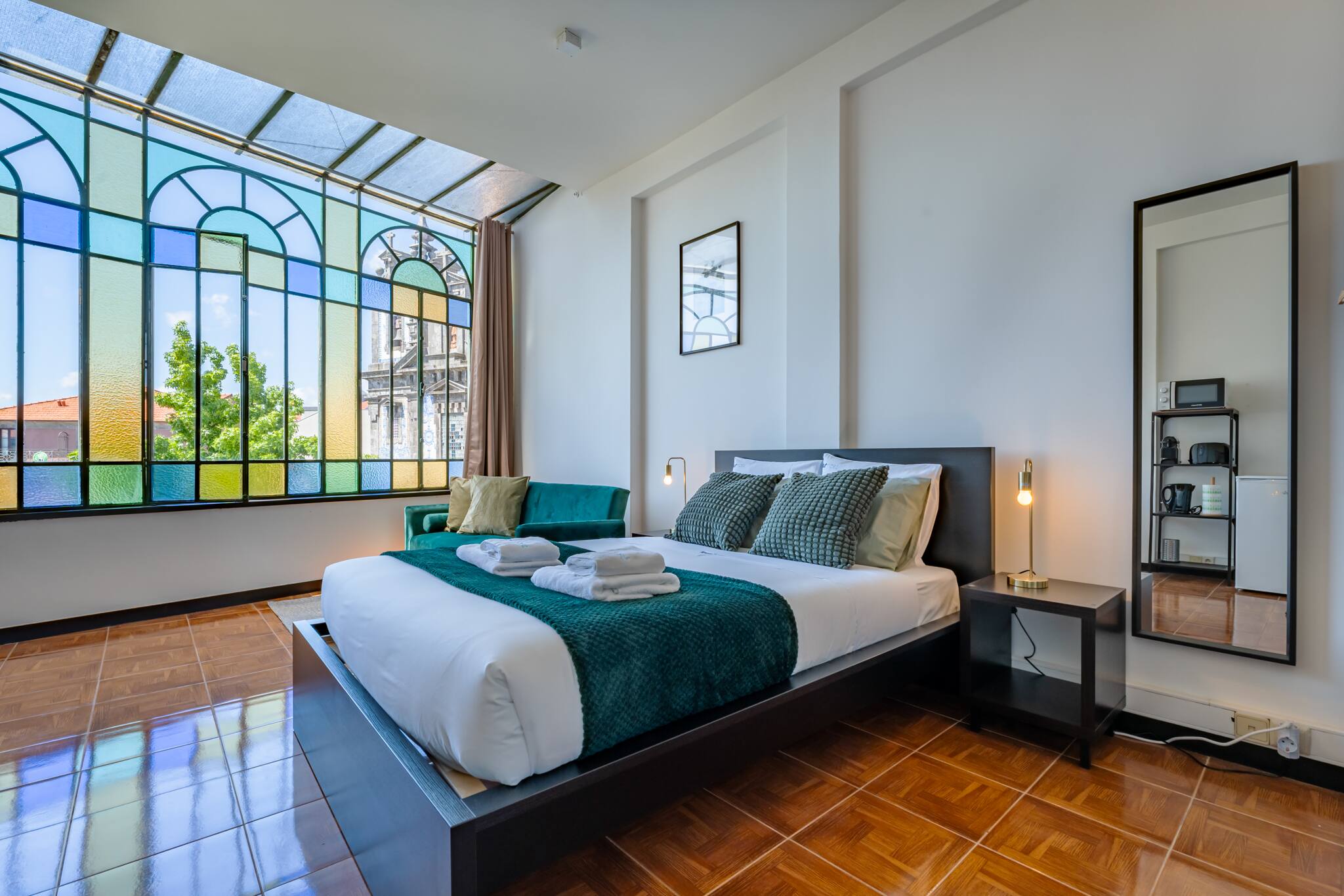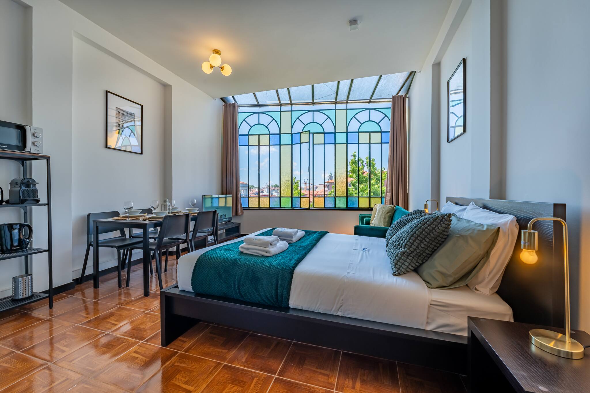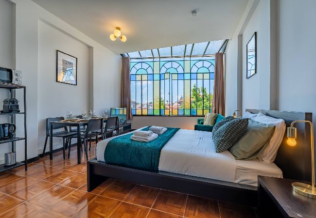 A sala de estar é espaçosa e cheia de luz natural, com janelas amplas coloridas que oferecem vistas deslumbrantes da cidade. Decorada com móveis modernos e confortáveis, é o local ideal para relaxar após um dia explorando o Porto. A cozinha totalmente equipada com todos os eletrodomésticos necessários, incluindo um fogão, micro-ondas, Chaleira, tostadeira e máquina de café. Os ladrilhos coloridos adicionam um toque de charme e autenticidade. O apartamento estudio possui uma transição suave e harmoniosa entre espaços decorado com um estilo único e acolhedor. A cama é confortável, garantindo uma ótima noite de sono.