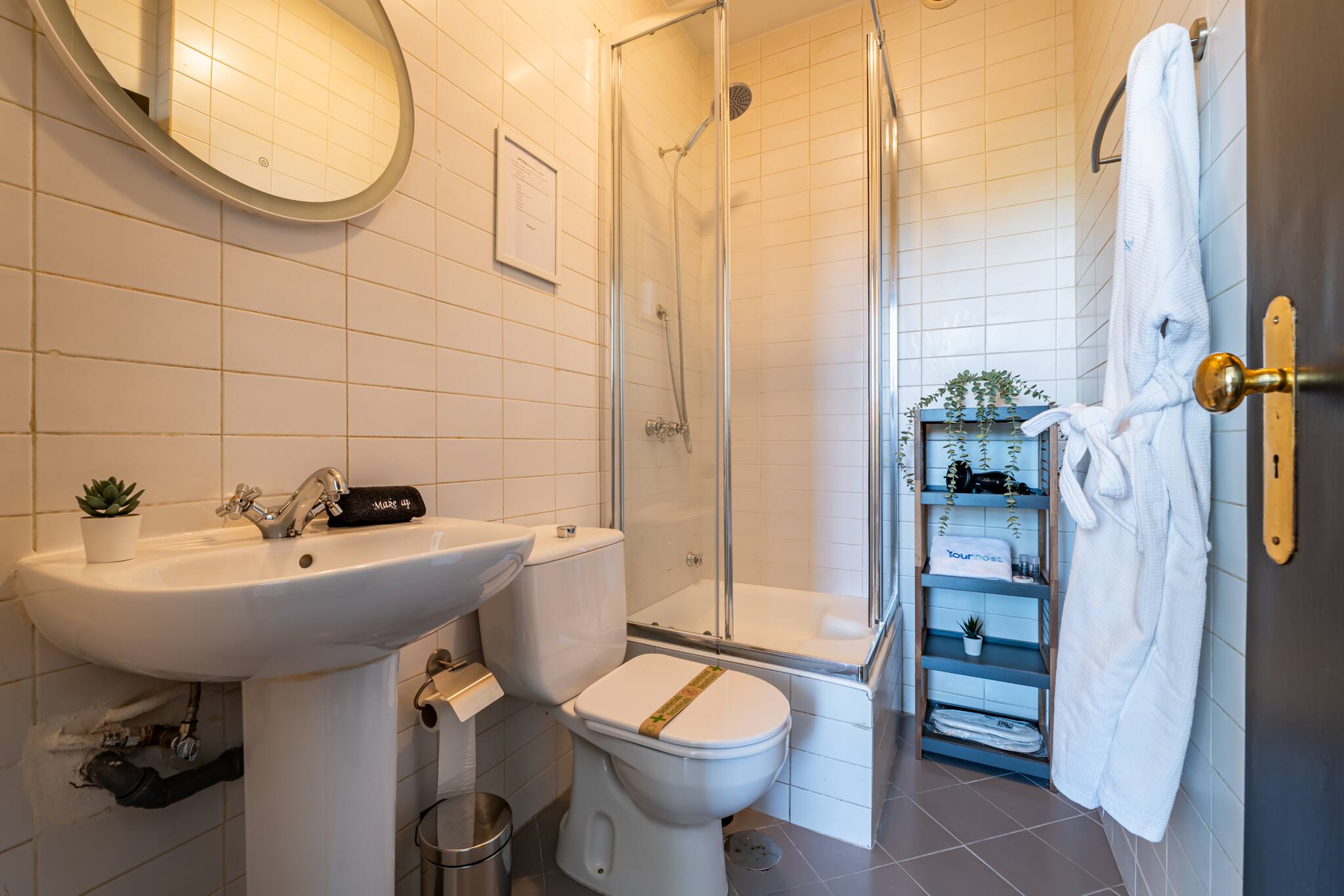A casa de banho é moderna e funcional, com chuveiro, toalhas macias e produtos de higiene pessoal.