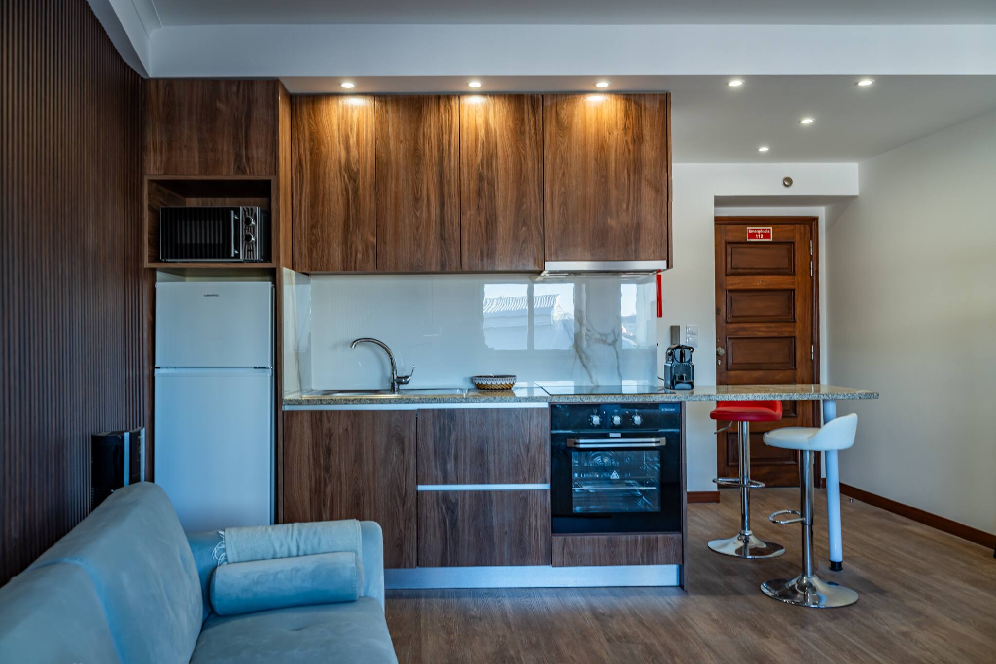 Nosso apartamento estúdio foi cuidadosamente projetado para oferecer o máximo de conforto em um espaço compacto. A decoração moderna e elegante cria um ambiente acolhedor e convidativo para você relaxar após um dia de exploração pela cidade. A área de estar/dormir é equipada com uma confortável cama de casal, perfeita para uma boa noite de sono. A kitchenette compacta está totalmente equipada com tudo o que você precisa para preparar suas próprias refeições, se desejar, incluindo fogão, geladeira, micro-ondas e utensílios de cozinha. O banheiro privativo oferece um chuveiro revigorante e todas as comodidades necessárias para sua estadia.