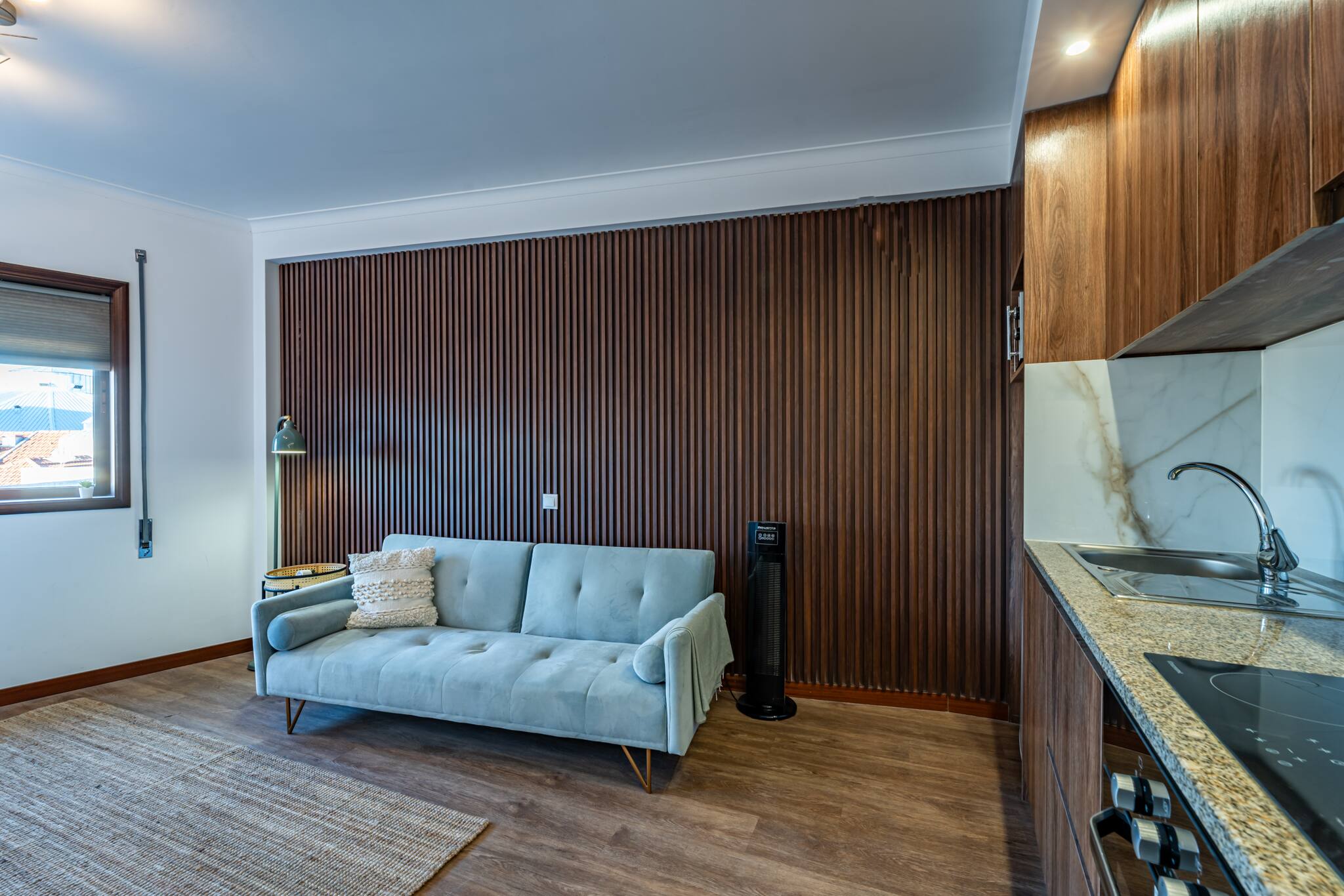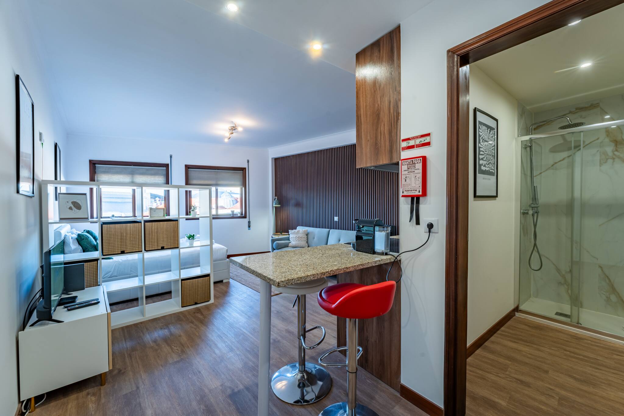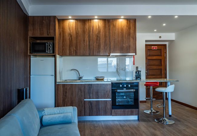 A sala de estar é espaçosa e cheia de luz natural, com janelas amplas coloridas que oferecem vistas deslumbrantes da cidade. Decorada com móveis modernos e confortáveis, é o local ideal para relaxar após um dia explorando o Porto. A cozinha totalmente equipada com todos os eletrodomésticos necessários, incluindo um fogão, micro-ondas, Chaleira, tostadeira e máquina de café. Os ladrilhos coloridos adicionam um toque de charme e autenticidade. O apartamento estudio possui uma transição suave e harmoniosa entre espaços decorado com um estilo único e acolhedor. A cama é confortável, garantindo uma ótima noite de sono.