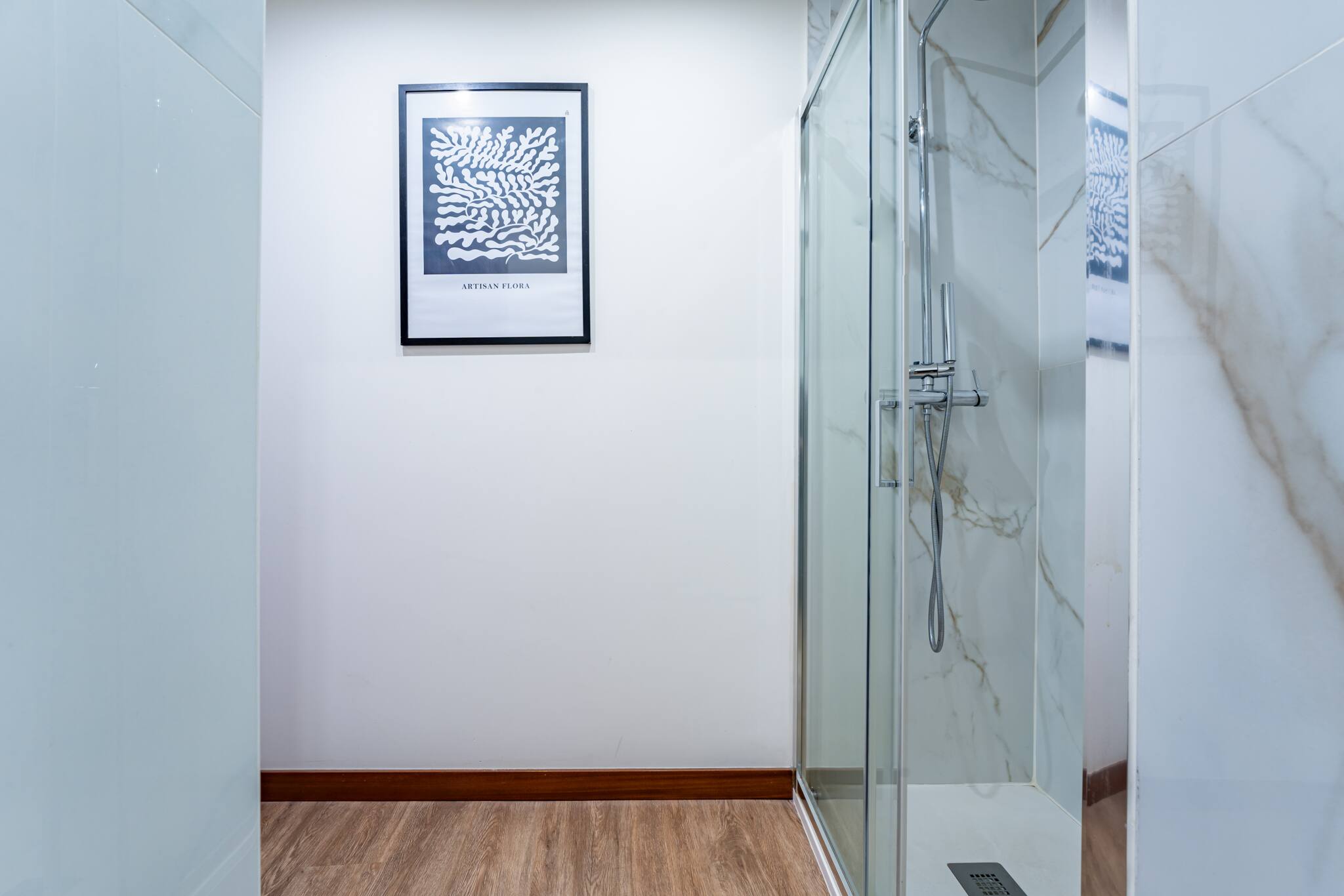 A casa de banho é moderna e funcional, com chuveiro, toalhas macias e produtos de higiene pessoal.
