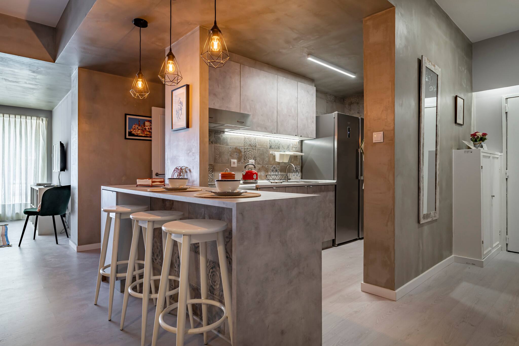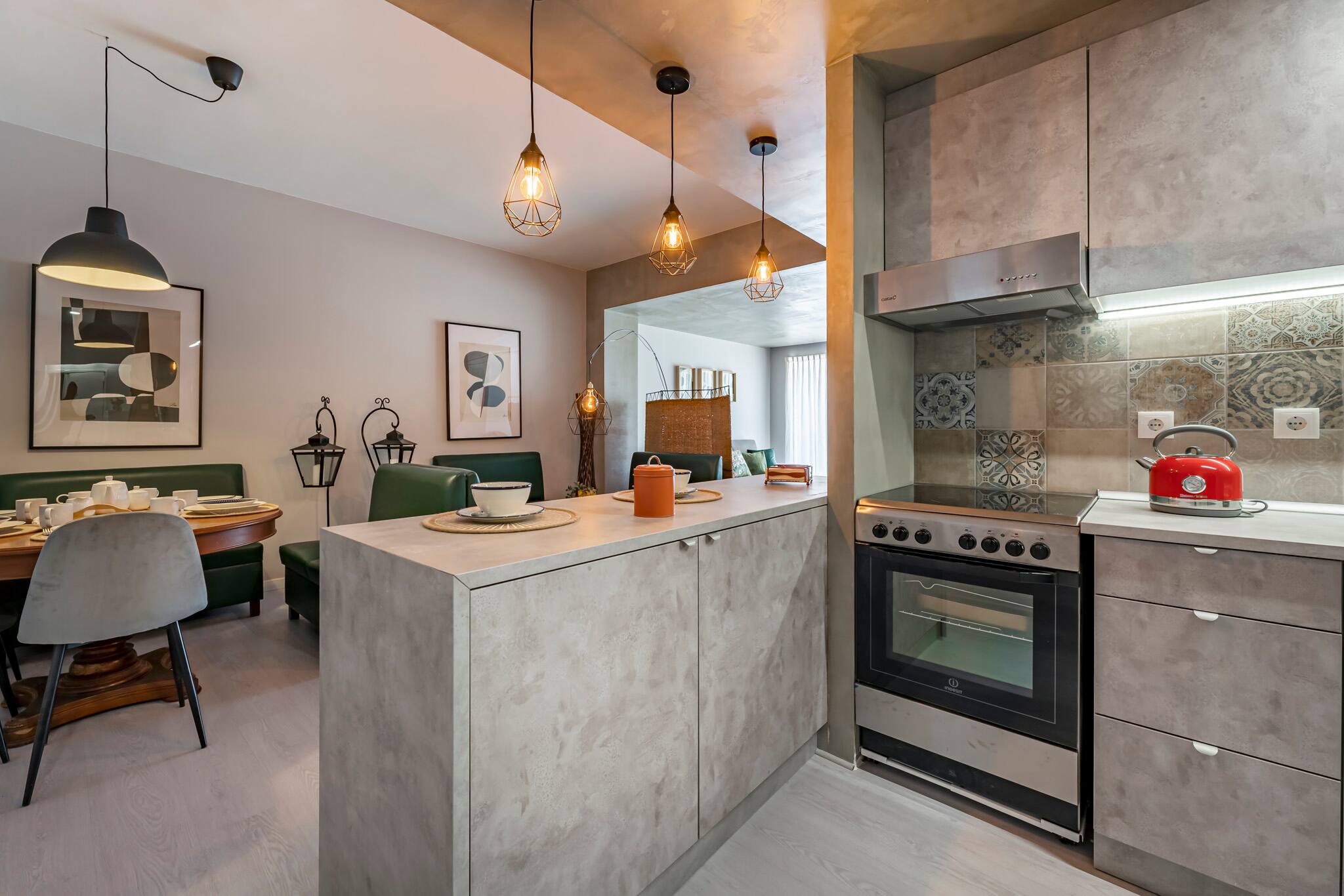 A cozinha americana totalmente equipada permite-te preparar refeições deliciosas. Encontrarás todos os eletrodomésticos essenciais: frigorífico, forno, micro-ondas, máquina de café e louça completa. A televisão e WiFi garantem momentos de entretenimento e conectividade.