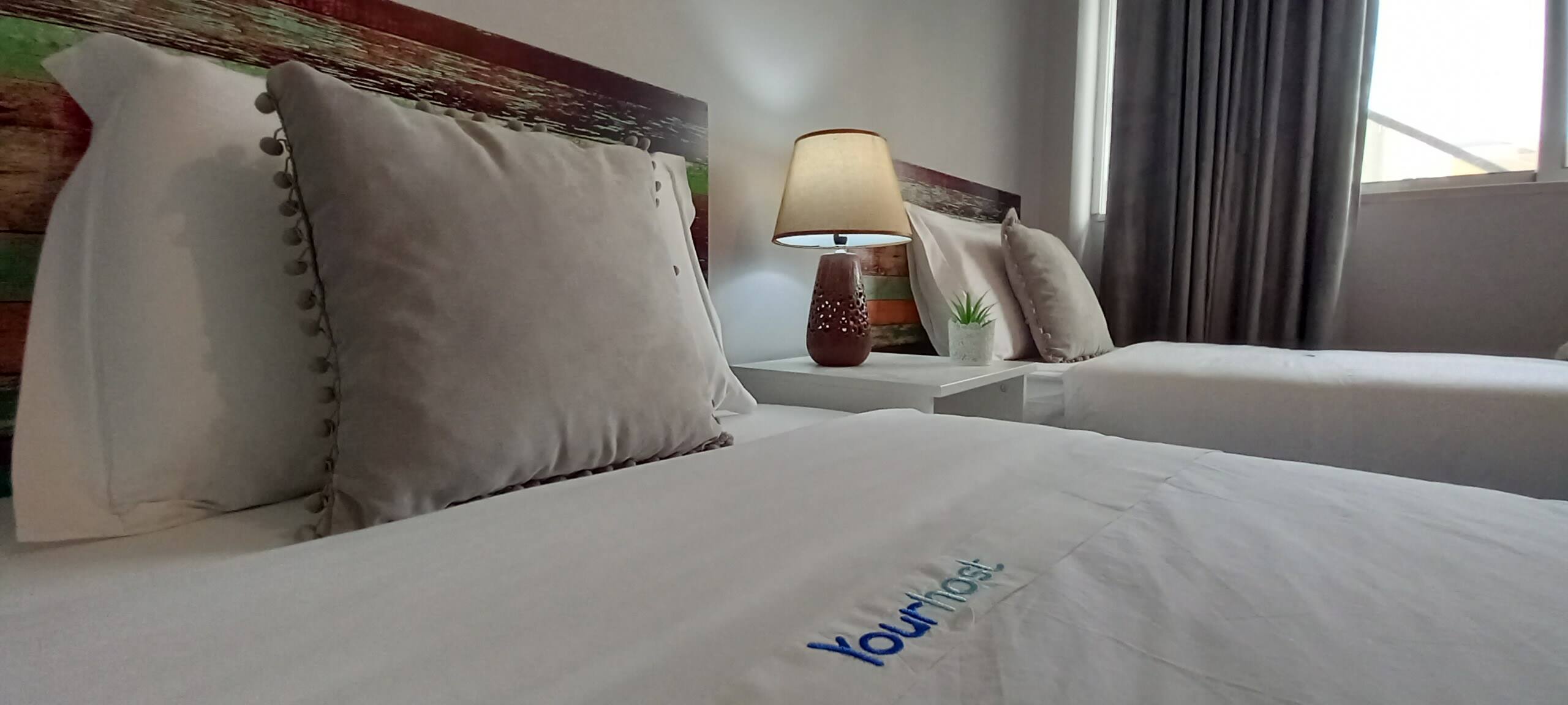 O quarto conta com dois camas individuais, garantindo um descanso confortável para cada hóspede. A área dispõe de ar condicionado para manter a temperatura ideal em qualquer altura do ano. Com duas casas de banho partilhadas equipadas com chuveiro, não terás de disputar o espaço de banho.