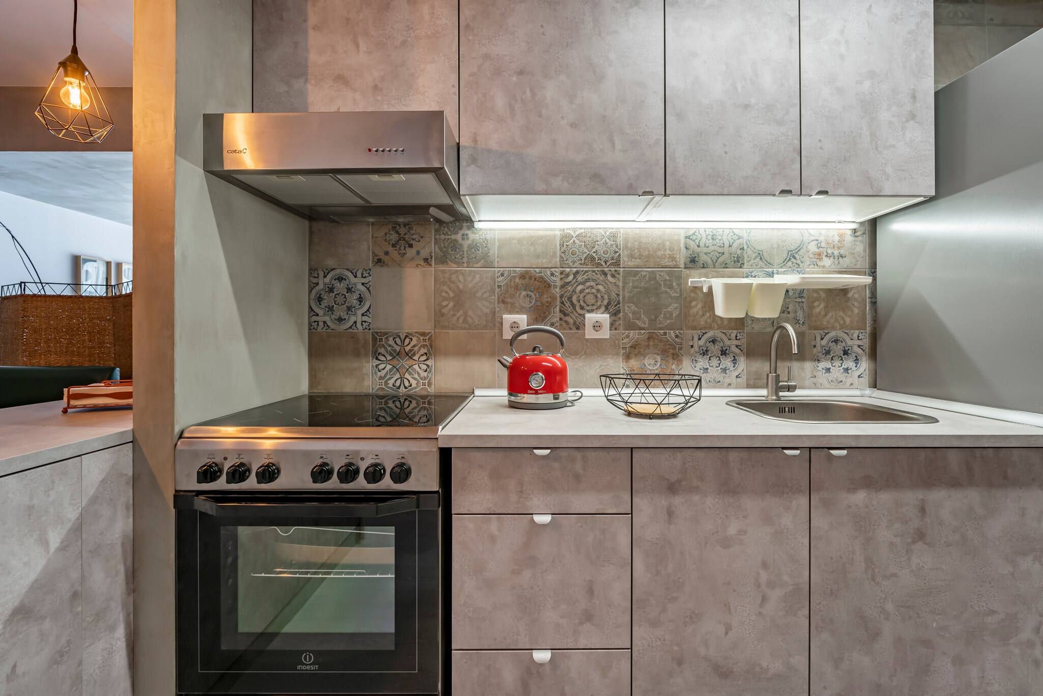 A cozinha americana está totalmente equipada com todos os eletrodomésticos essenciais: fogão de indução, frigorífico, forno, micro-ondas, torradeira, máquina de café e chaleira. Encontrará também todos os utensílios de cozinha necessários para preparar refeições deliciosas.